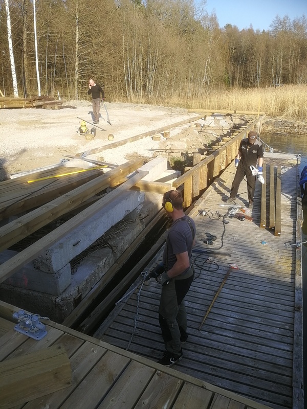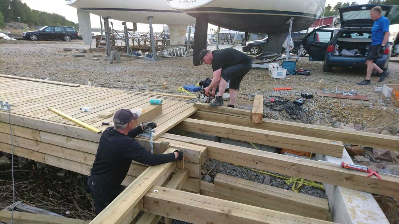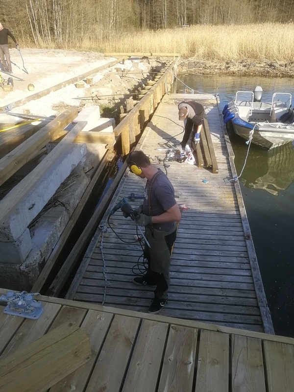 3 kpl betonipaaluja upotettu junnualueelle joista tartunnat tehty paalutuksen etureunaan. Kestää nyt isommatkin sateet ja maanpaineen. 8.5. jatkoimme runkorakenteen tekemistä ja nyt jatkamme miltei päivittäin iltaisin tekoa jotta saamme junnujaoston ja muiden vapaaehtoisten avulla junnulaiturin kannen tehtyä torstaina 17.5. klo 16:00 eteenpäin. Tavoitteena saada kansi mahdollisimman valmiiksi sekä koko etureunan laudoitusta vesirajan alle ulottuen. Jatketaan maanantaina 21.5. 16:30 eteenpäin. Uusi ponttoonilaituri tehty ja tuotu viikonlopun 19.-20.5. aikana sekä ankkuroidaan kun painot ja kettingit saadaan. Viimeistelyyn ja ponttonilaiturien kiinnitykseen menee pari iltaa. Lisäksi vedenkorkeuden mukaan säätyvä 3m leveä jollien laskuluiska ottaa myös oman aikansa. Tavoitteena edelleen että junnualueen laiturit valmiudessa 4.6. jolloin junnujen alkeiskurssi alkaa. Tällöin lähtö ja tulo iltaisin Kotisatamaan.